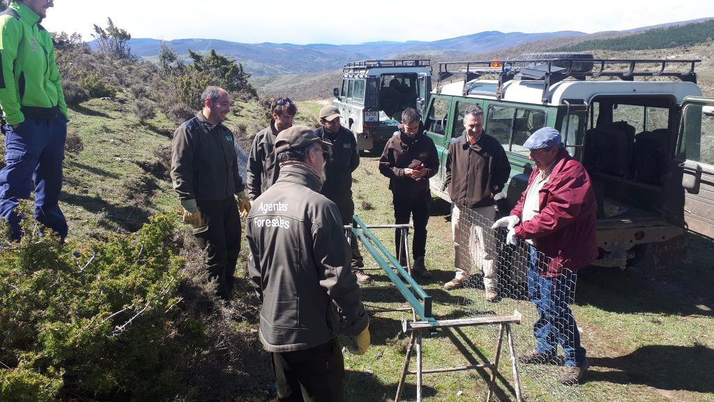 Posteriormente fuimos a San Román de Cameros (Cañón del Leza) donde nos llevaron a campo donde hicimos una demostración práctica de instalación de protectores con técnicos, agentes forestales, el Alcalde del pueblo que venía en representación de la Asociación de Ganaderos